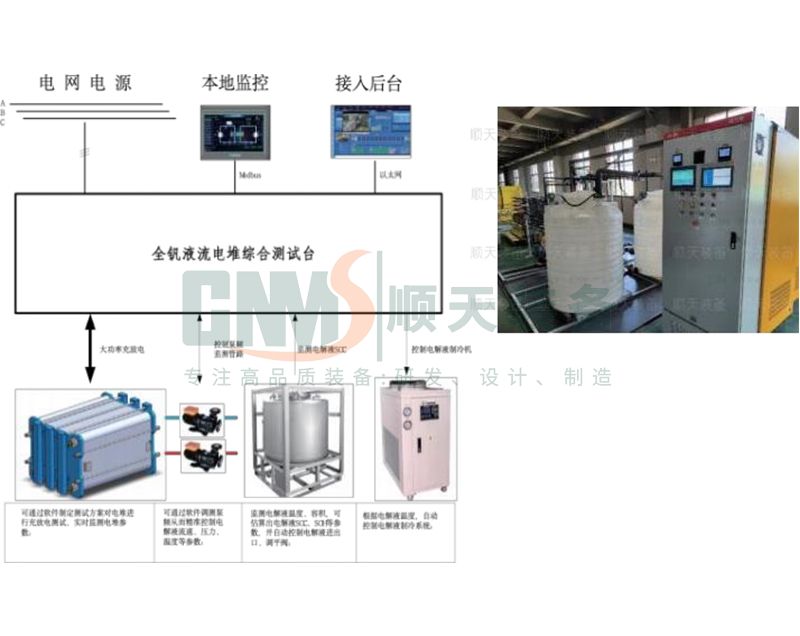 Automatic pump control according to the set electrolyte flow rate and pressure; the inverter can be controlled according to the set value, and the electrolyte flow rate, pressure and temperature can be monitored and recorded in real time. Monitoring of electrolyte system SOC; recording of system SOC according to the test condition of the power stack.