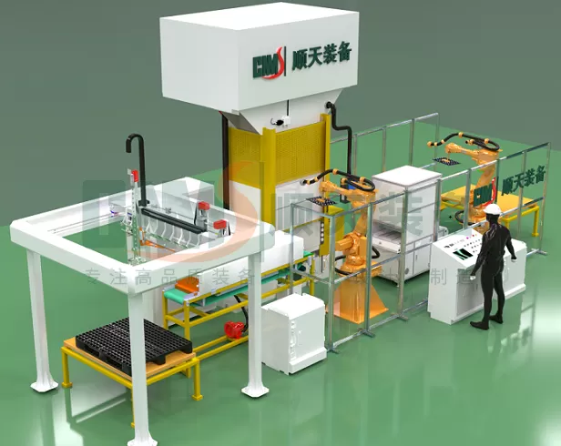 Flexible graphite sheet molding line is a specialized equipment for the pressing and forming of expanded graphite sheets, appearance inspection, material stacking, and basket loading of fuel cell bipolar plates. The expanded graphite sheet is manually placed on the transfer cart and transported to the feeding station, and then the six axis robot adsorbs the expanded graphite sheet to the pressing station.