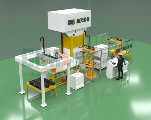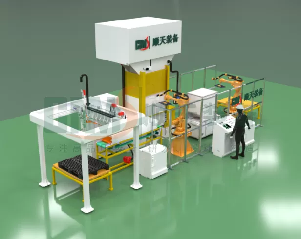 Flexible Graphite Plate Pressing Line: Specialized equipment primarily used for pressing expanded graphite plates into shape, performing visual inspections, cutting and stacking, and loading into baskets for fuel cell bipolar plate manufacturing. Expanded graphite plates are manually placed onto transfer carts and conveyed to the feeding station. A six-axis robot then uses suction to lift the plates to the pressing station. The pressed graphite plates become single-plate components. After visual inspection, defective items are rejected, while qualified products are loaded into baskets and transported via carts to the impregnation workshop.